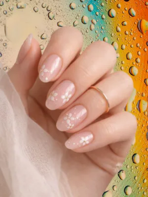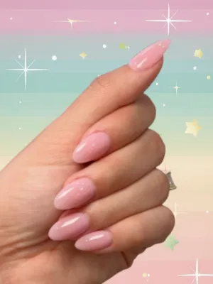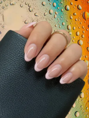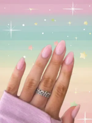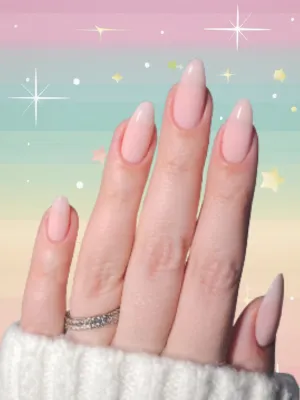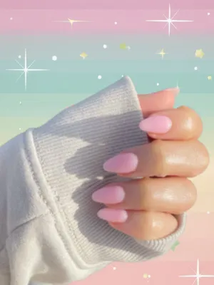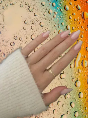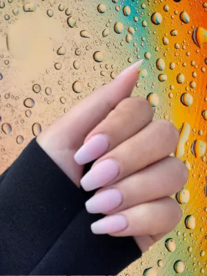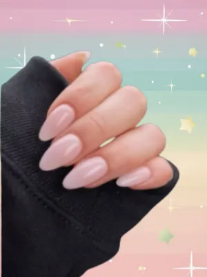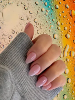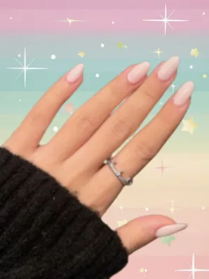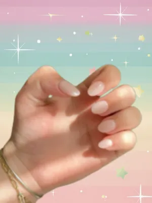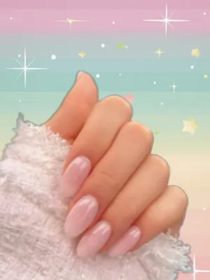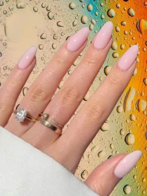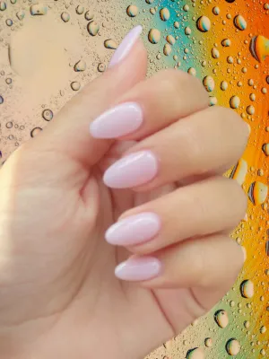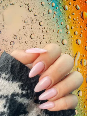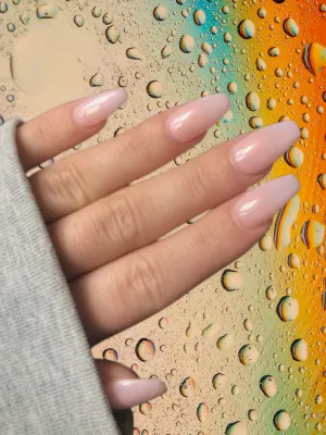 Almond-shaped bubble bath nails elongate the fingers gracefully. The curved tips combined with sheer pink polish create a soft, romantic silhouette.