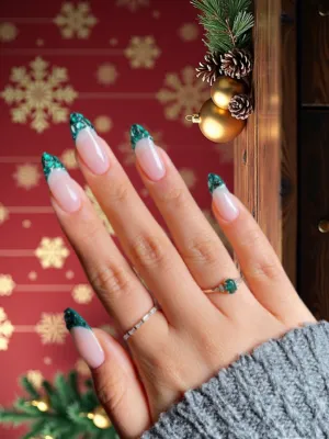 Classic French tips get a festive upgrade with green bases and gold glitter tips. This combo adds sparkle while keeping the design elegant.