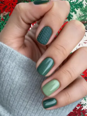 Sweater-inspired textures on green nails create a cozy winter feel. The knitted design adds warmth and uniqueness.