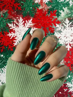 A mirror-like green chrome finish creates a bold, futuristic holiday look. The reflective shine catches light beautifully, making your nails stand out at every festive event.