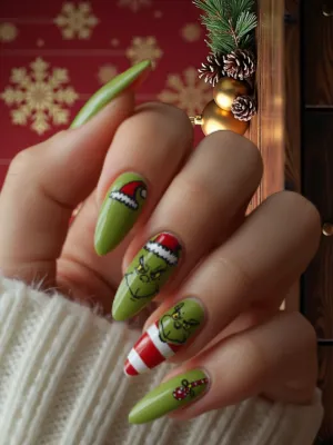Inspired by the Grinch, this design features green tones with quirky details like eyes or expressions, adding humor and personality.