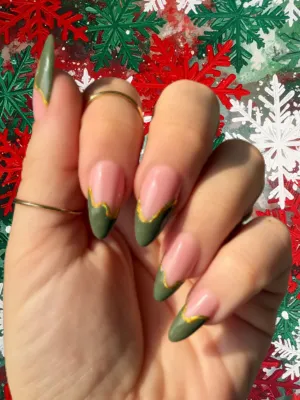 Soft sage green tips outlined with gold create a delicate and elegant finish. This design feels minimal yet luxurious and festive.