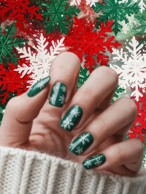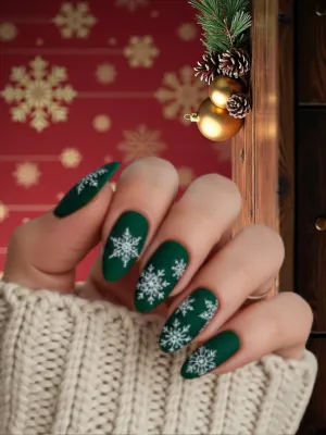 Delicate white snowflakes over a rich green base create a winter wonderland effect. The contrast adds charm while keeping the design festive and graceful.