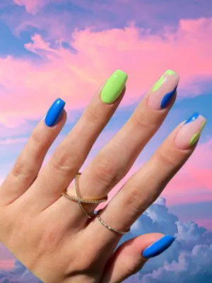 These edgy tips blend electric blue into neon green, creating a bold punch of vibrant color with a futuristic vibe.