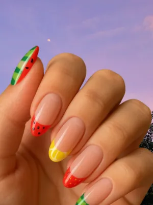 Strawberry pinks, lemon yellows, and kiwi greens on each tip give fruity, vibrant energy—juicy and youthful.