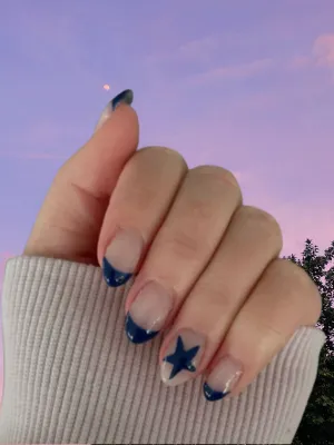 Nude base with bright tips and teeny star decals—like a shooting star moment at your fingertips.