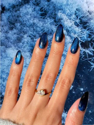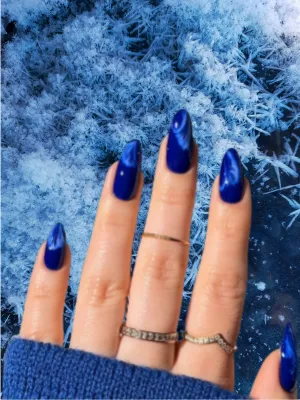 Dark blue and sparkles combine navy polish with shimmering accents, giving a frosty and magical winter glow.