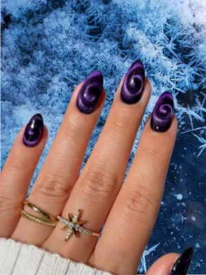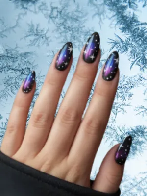Galaxy winter nails blend dark purples, blues, and glitter swirls to create a cosmic winter night effect.
