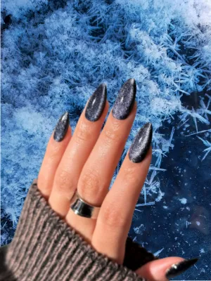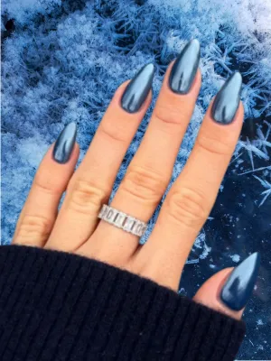 Midnight chrome winter nails feature a deep metallic blue-black base with mirror shine that reflects light beautifully, creating a sleek and frosty futuristic vibe.