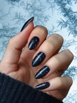 Starry winter night nails feature deep midnight bases with tiny silver stars and shimmer, capturing the beauty of a snowy evening sky.