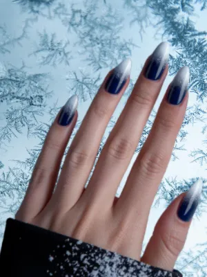 Icy ombre dark winter nails blend deep blues into frosty silvers, creating a smooth gradient that mirrors winter frost.