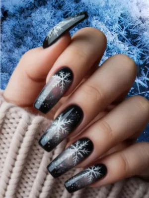 Black snowflakes nail design features dark matte or glossy bases with contrasting white flake patterns.
