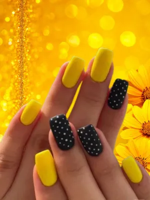 This manicure combines matte yellow with bold black contrasts, creating a striking and modern visual balance.