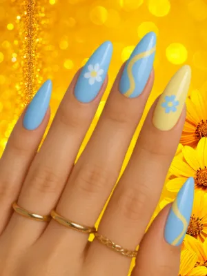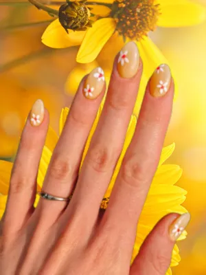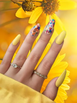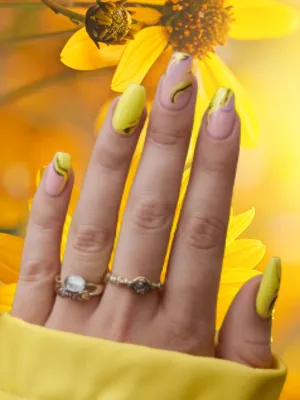 Bright yellow nails with accent details deliver instant summer energy and playful appeal.
