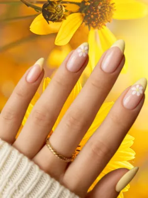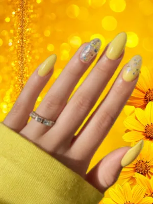 This design features tiny dried yellow flowers sealed into clear or nude bases for a natural look.