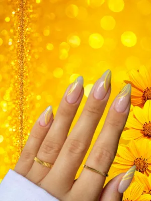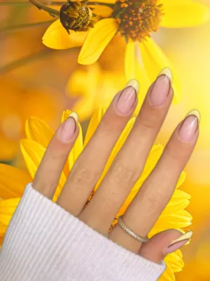 This half-French style balances nude bases with yellow tips for modern elegance.