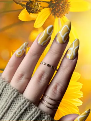 Modern patterns and fresh yellow tones create a stylish, up-to-date manicure.