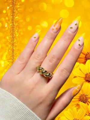 Warm honey-yellow shades paired with glossy or drip-style accents create a sweet, rich manicure inspired by golden honey.