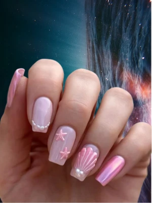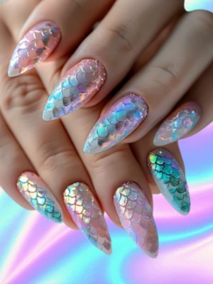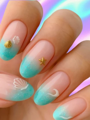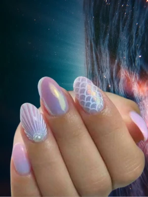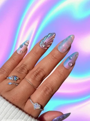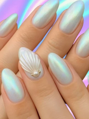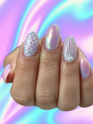 Mermaid nails are ocean-inspired manicures that include elements like iridescent shimmer, seafoam hues, scales, pearls, shells, and aquatic themes.