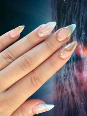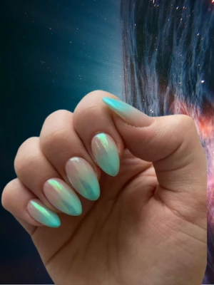 Nude base with subtle aqua chrome tips in a soft stiletto shape—chic and understated mermaid flair.