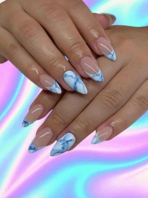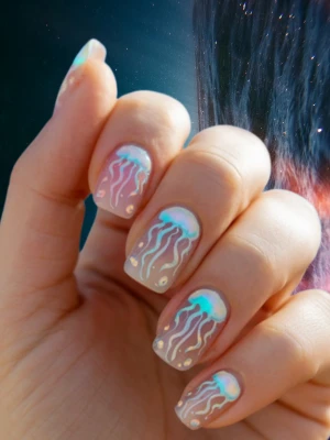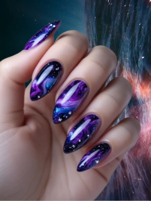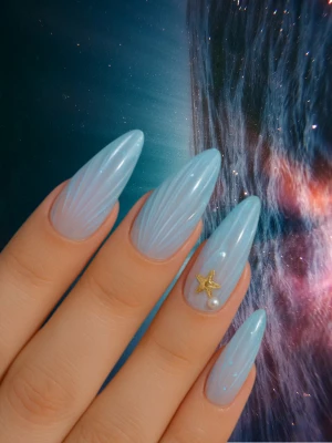 Cosmic swirls meet aquatic vibes in this mystical set that blends deep blues and purples with subtle iridescence for a truly otherworldly manicure.