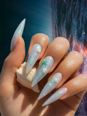 Capture the shimmer of ocean treasures with translucent nails decked in glittery seashell art and micro pearls—like carrying the shore with you.