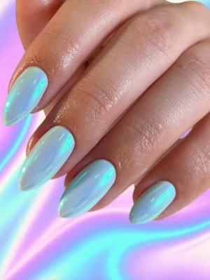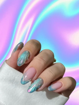 French tips go full oceanic with holographic aqua polish that shimmers like sunlit waves. Elegant, glossy, and mesmerizing.