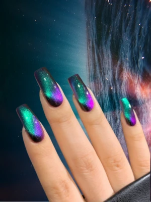 Dive into dual-tone cat eye polish blended in a smooth ombré from sea green to violet, giving a magnetic, deep-sea shimmer.