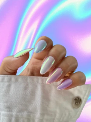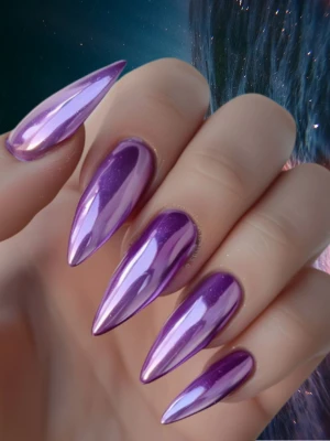 These long, sharp stiletto nails shine with a chrome mermaid finish, commanding attention like sirens from the deep sea.