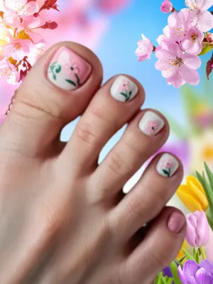 Soft pink base with floral accents creates a romantic and fresh style. These toe nail designs for spring feel delicate and charming.